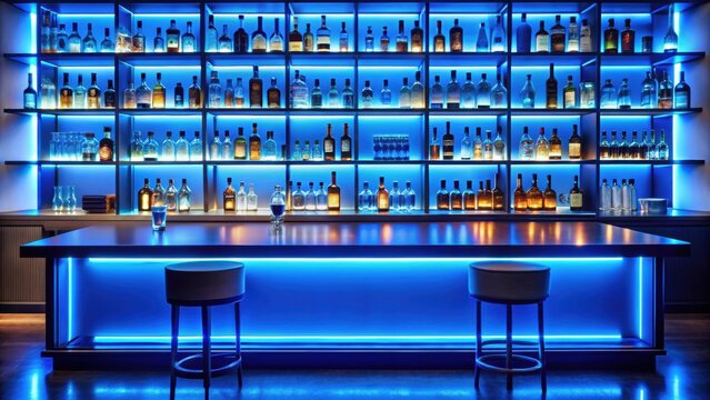 Empty bar with blue counter and shelves of liquor, illuminated by bright lights , bar, blue, counter, shelves, liquor