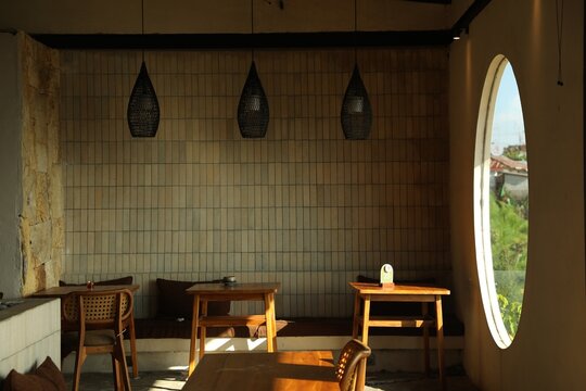 The lobby of a trendy cafe or boutique hotel equipped with several drum hanging lamps
