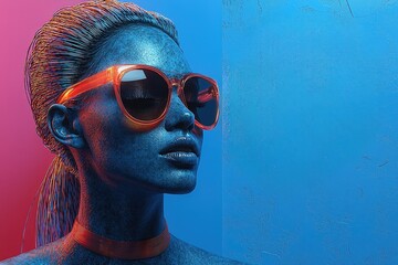 Futuristic woman with blue skin wearing orange sunglasses and choker in colorful neon lighting against blue wall