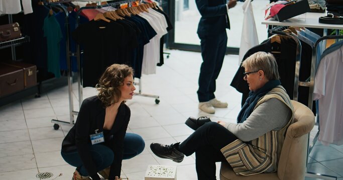 A stylish display of women’s footwear, featuring trendy heels and flats on a sleek retail shelf.