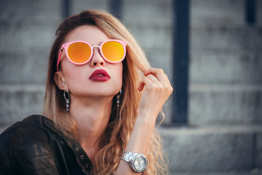 young beautiful sexy woman sitting on the stairs in leather jacket in glases