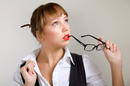 Portrait of elegant young beautiful caucasian woman in formal clothes posing over gray background. The concept of beauty and success. Attractive woman concept. Copyspace