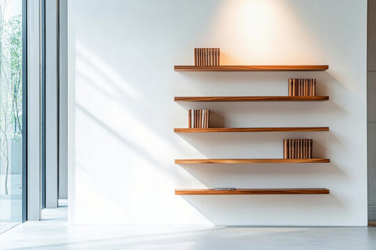 Minimalist library design with wooden shelves and books on glas