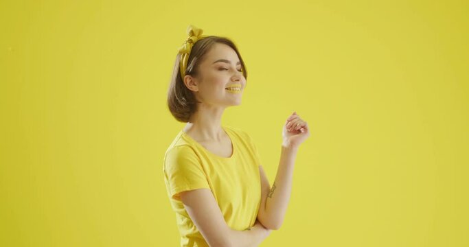 Let me think. Doubtful, thoughtful child girl posing over yellow background, copy space