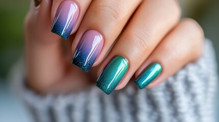 Woman holding espresso martini cocktail in elegant coupe glass on turquoise background