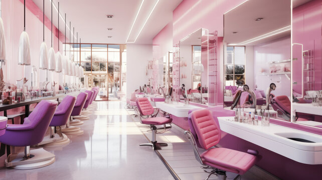 Modern beauty salon interior, luxury empty cosmetic store. Bright clean nail service shop, trendy pink manicure studio design. Concept of fashion, glamour, spa, makeup