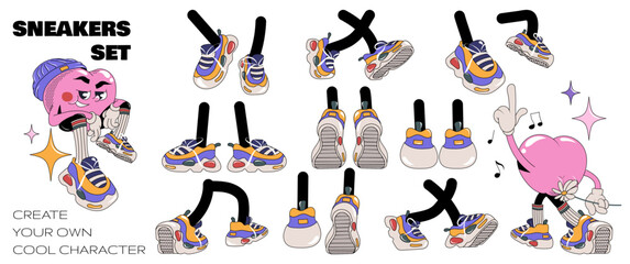 Cool trendy feet and boot vector collection. Cartoon feet in colored sneakers different poses, leg standing, walking, running, behind view. Isolated mascot footwear