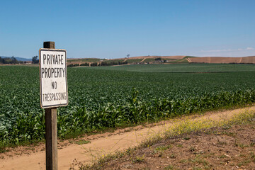 Private Property sign seen attached to a farm gate, warning members of the public not to enter the meadow as cattle roam free.