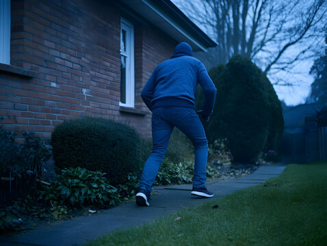 Hooded Figure Walks Away from a Brick House at Dusk on a Sidewalk