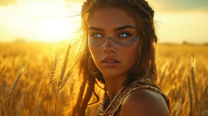 A vibrant portrait of a woman with tribal face paint and feathers.