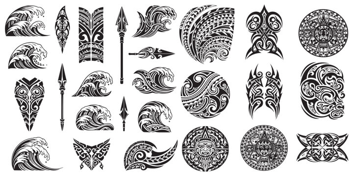 Collection of intricate maori inspired tribal tattoo designs and polynesian art elements featuring spears and abstract patterns on white background