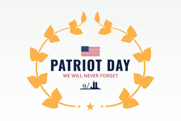 9/11 patriot day tribute banner with brush-style american flag and red stars on white background, we will never forget september 11 memorial design