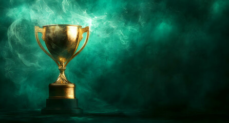 A shiny golden trophy stands proudly against a misty green background, symbolizing victory and achievement in sports competitions.