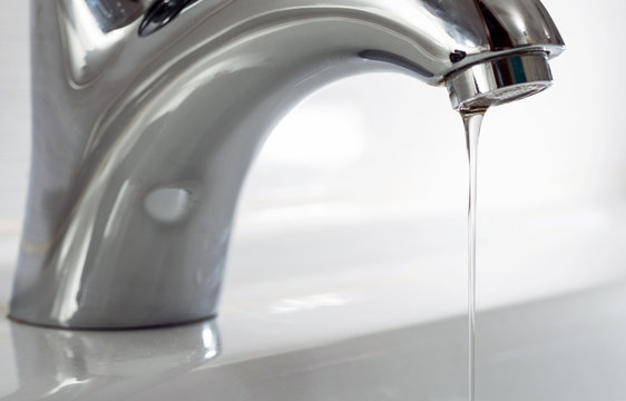 A thin trickle of clean water pours from the tap into the sink.