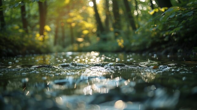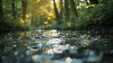 The gentle trickle of a stream combined with the rustle of leaves on tall trees creating a serene and calming atmosphere. 2d flat cartoon.