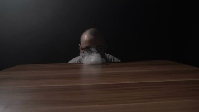 Young hipster teenager boy performing vaping tricks while making a steam wave on the table and then a tornado using his hand in slow motion