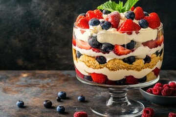 Fresh berry trifle in glass bowl on rustic table