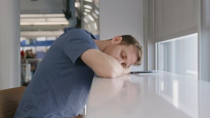 man Sleeping in an airport while waiting for his flight. He is napping comfortably on a bench, with his head resting on his arms. delays in flights, long travel time and the challenges of air travel.