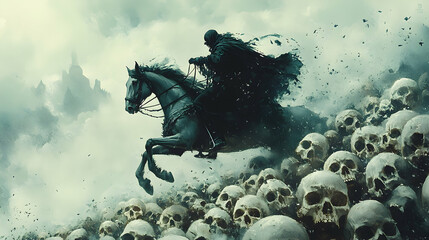 Epic horseman rides through a skull-laden battlefield fantasy dark atmosphere dramatic perspective adventure theme