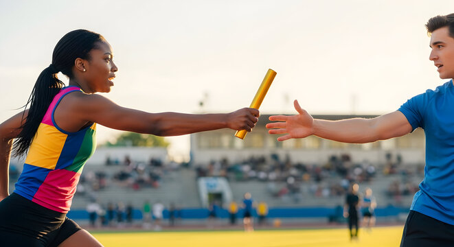 Relay Race Success Teamwork and Partnership Concept Achieved Goal in Sports Business Competition Handing Off the Baton in a Dynamic and Powerful Moment of Triumph