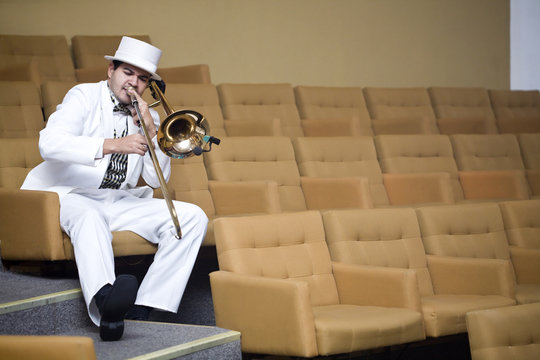 Big Band: muted trombone solo. From a series of images of musicians in a swing Jazz band.