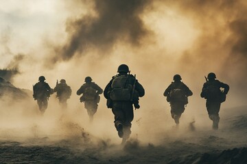 Warriors Marching Onward: A powerful image capturing a group of soldiers in silhouette, moving resolutely forward through a smoky battlefield. This photo evokes the essence of courage, duty.