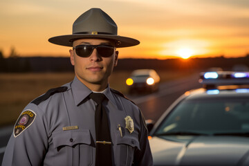 A dedicated State Trooper stands tall in his uniform, with the setting sun casting a warm glow over the highway and his patrol car in the background