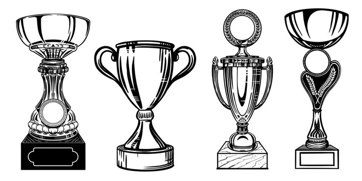 Sketch Set of cups and trophies hand drawn. Isolated on white background. Vector.