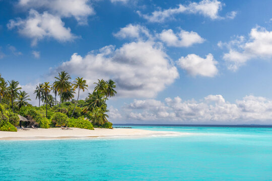 Popular tropical destination scene. Exotic beach palm trees white sand and calm seascape. Amazing travel landscape, best paradise island holidays. Perfect colorful relax background. Sunny summer sky