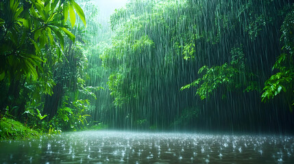 Tropical Rainforest Downpour: Lush Greenery Under Heavy Rainfall