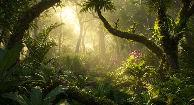 Lush tropical rainforest with vibrant green foliage and sunlight filtering through dense canopy – photorealistic nature scene with rich details, perfect for eco, travel, and environmental themes