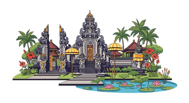 Illustration of a Balinese temple with traditional architecture, surrounded by lush tropical plants and a pond with lotus flowers.