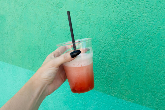 red drink in hand in front of tropical seafoam green blue wall with black nails