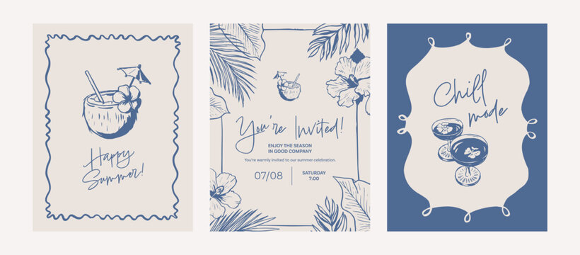 Hawaiian party hand drawn templates. Summer doodle poster. Event invitation card set. Boho holiday drawings. Illustration of drink, cocktail and tropic leaves. Graphic ink style sketch.