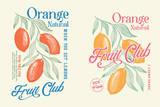 Set of seasonal fruits labels and vegetables stickers and marks or badges template for packaging isolated on black background. Vector illustration