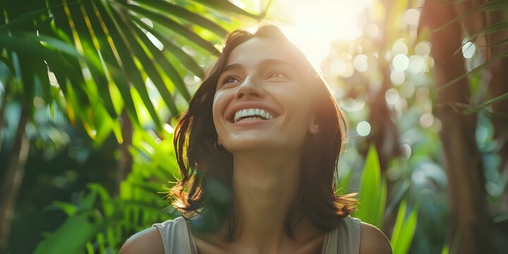 Serene woman meditates with tropical flower for peace promotion