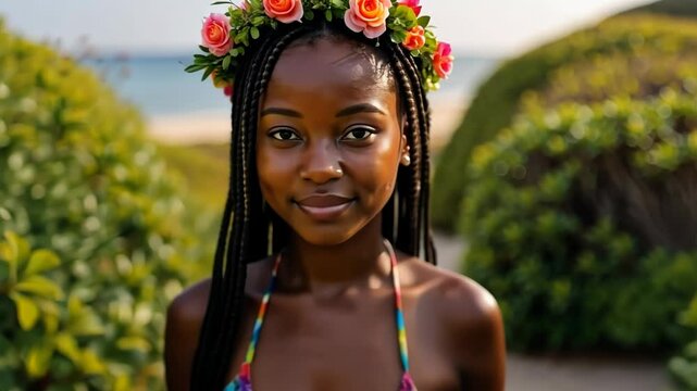 Serene woman meditates with tropical flower for peace promotion