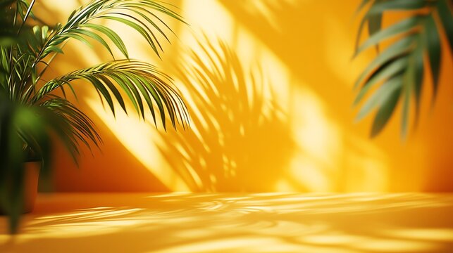Bright yellow background with palm leaves casting shadows creates a sunny, tropical mood. Perfect for product displays or summer themed designs.
