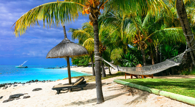 Paradise beach of a tropical island, palm trees, white sand, azure water, Generative AI.
