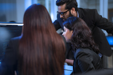 Data center engineer wearing headset microphone providing remote diagnostics using tablet. Technician monitors system health and guides users through infrastructure troubleshooting steps