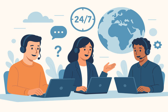 24/7 Customer Service Hotline Operators Consulting Clients with Headsets at Computers, Global Online Technical Support, Call Center Team, Call Processing System, Modern Flat Vector Illustration