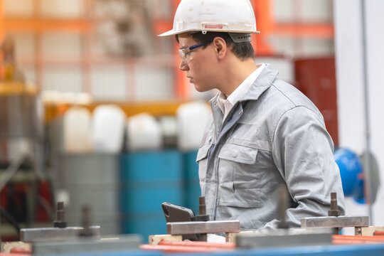 Inspecting industrial machinery worker in factory photography manufacturing environment close-up view safety and precision