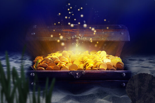 Treasure trove of gold coins in underwater cave. Hidden Treasure Cave. Illustration