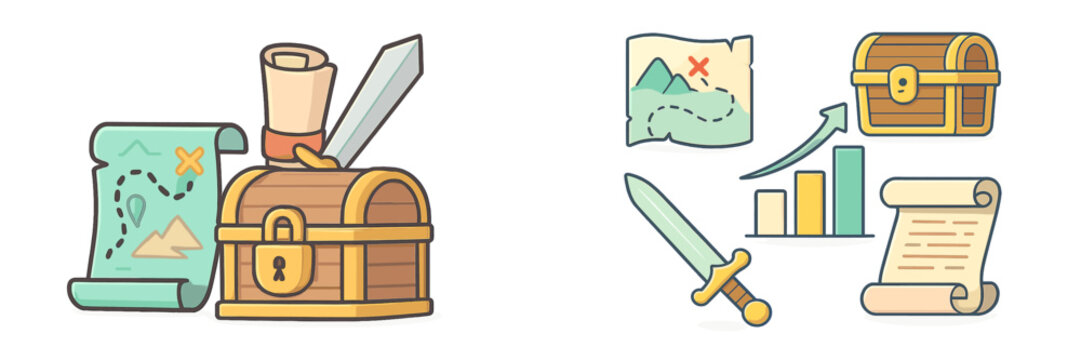 Treasure map and chest design featuring a sword and documents showcasing adventure elements and exploration themes