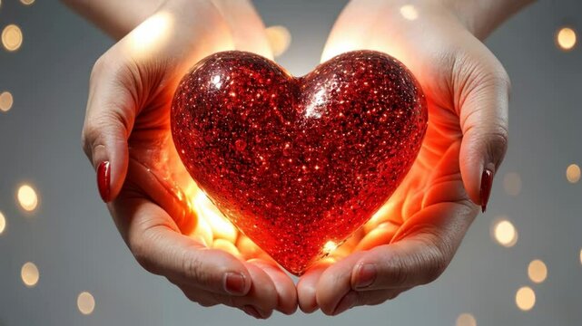 Glowing Red Glitter Heart in Hands: Valentine's Day, Love, and Romance, Shows Affection and Tenderness with Warmth