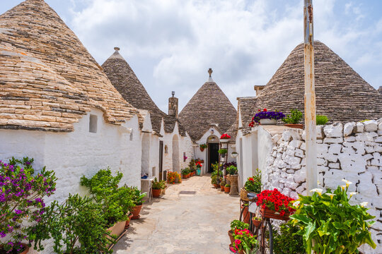 Trulli of Alberobello, Puglia, Italy. town of Alberobello with trulli houses among green plants and flowers