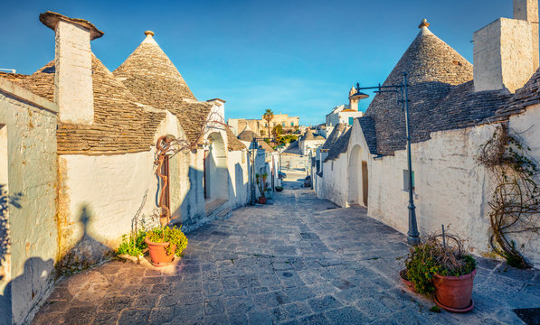 Colorful morning view of strret with trullo  -  traditional Apulian dry stone hut with a conical roof. Nice spring cityscape of Alberobello town, province of Bari, Apulia region, Italy, Europe.