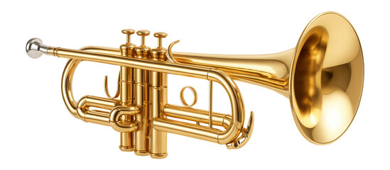 Shiny golden brass trumpet featuring detailed valves and mouthpiece on transparent background.