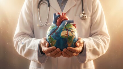 Doctor in white coat holding heart-shaped Earth globe with stethoscope for World Health Day theme.