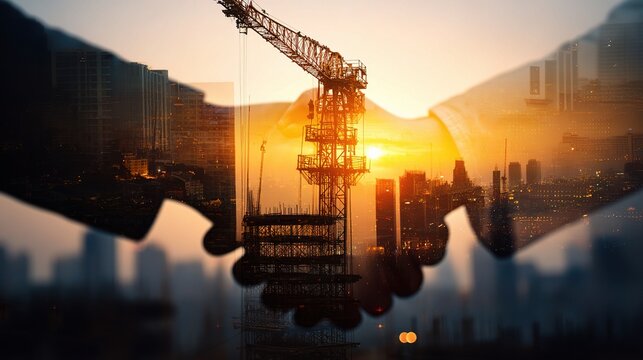 Construction Partnership with Crane at Sunset Over City Skyline